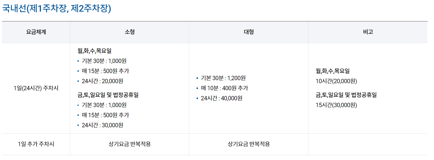 국내선 주차장(제1,2 주차장)의 경우 소형 기준 기본 30분 1,000원이며 15분마다 500원이 추가됩니다. 1일 주차 시 주중 20,000원, 주말 30,000원의 주차 요금이 부과되며, 1일 추가 시 동일하게 요금이 반복 적용됩니다.