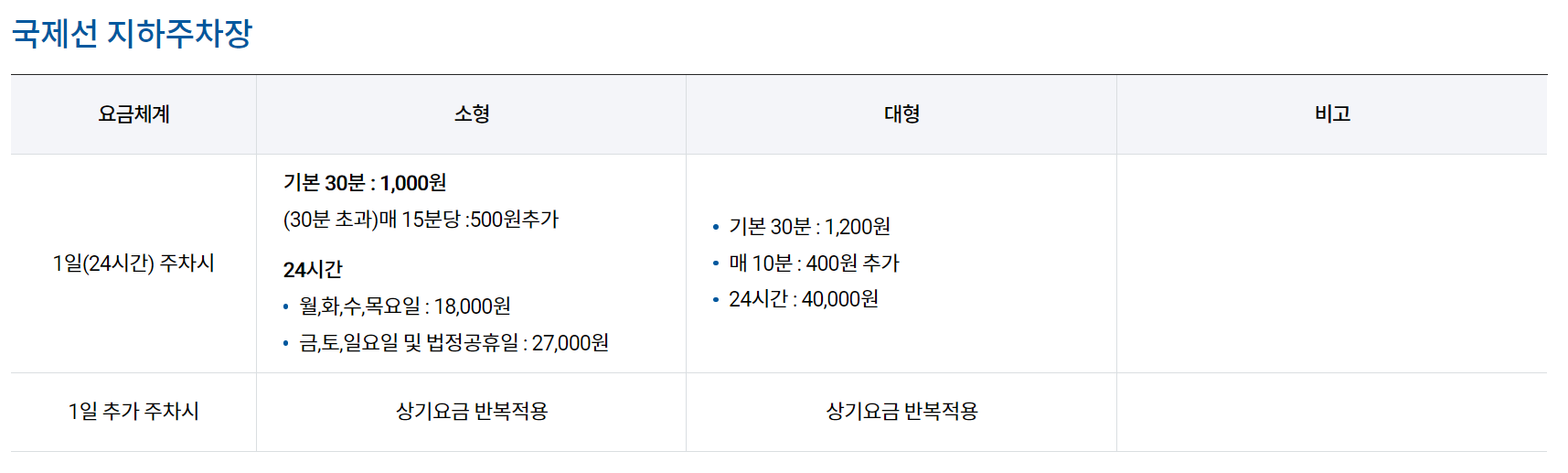 국제선의 경우, 지하주차장과 주차타워가 있습니다. 국내선과 주차 요금은 크게 차이가 없습니다만 지하 주차장의 경우 소형차량은 24시간을 기준으로 주중 2,000원, 주말(법정공휴일포함) 3,000원가량 저렴합니다.