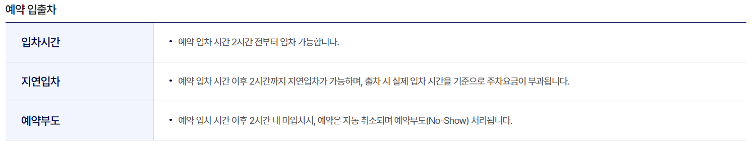 최소 2시간부터 최장 30일까지 예약이 가능하며, 입차 예정 1시간 전까지 변경 및 취소가 가능합니다. 예약부도를 하게 되면 보증금을 돌려주지 않으며, 1년간 2회 이상 예약 부도 시 3개월간 주차 예약 서비스를 이용하실 수 없습니다.