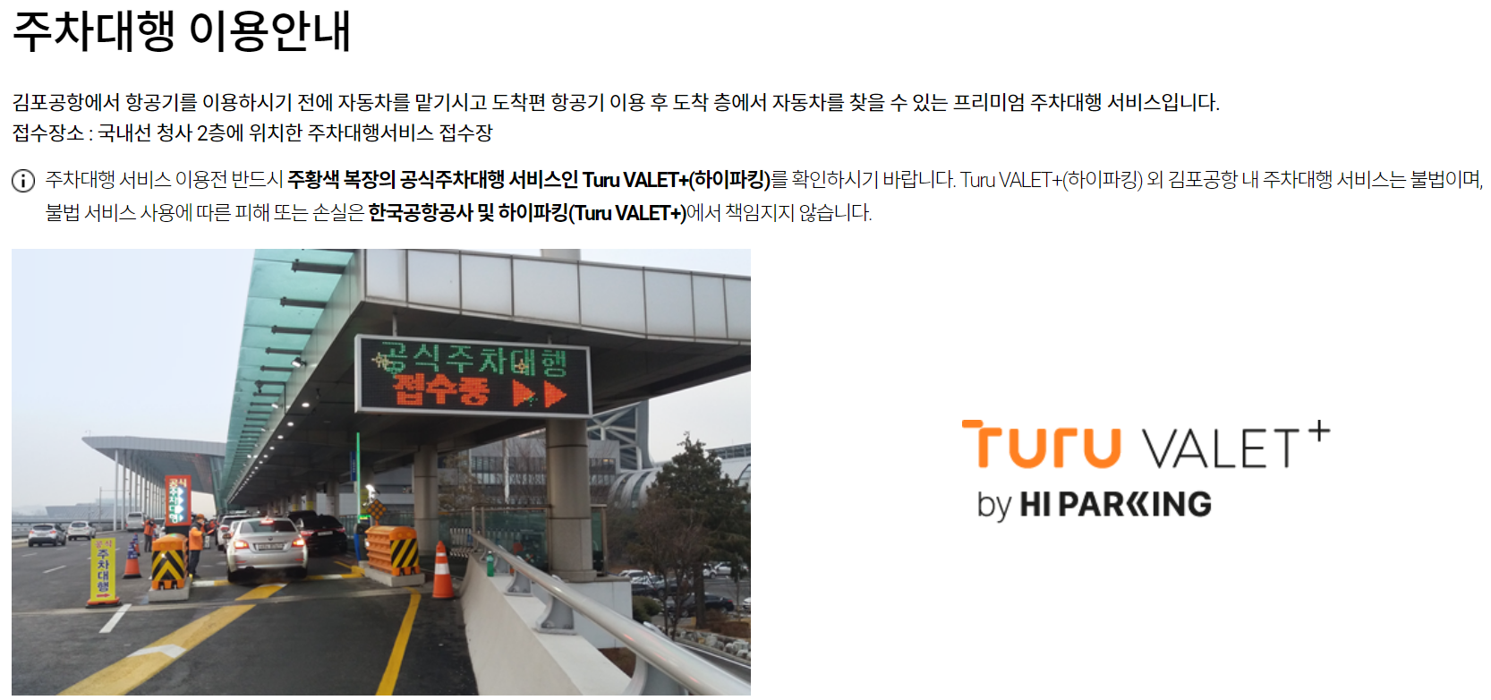 주차대행서비스 접수처는 국내선 청사 2층에 위치해 있으며, 서비스 이용 전 반드시 '공식 주차대행 서비스인 Turu VALET+(하이파킹)' 여부를 확인하시기 바랍니다. 이외의 김포공항 내 주차대행 서비스는 불법이며 불법 서비스 사용에 따른 피해는 책임지지 않는다고 하오니 유의하시길 바랍니다.