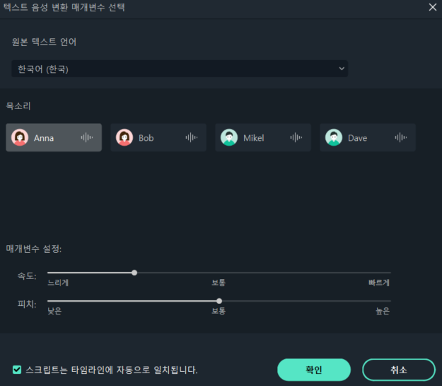 3. 매개변수 선택 창이 활성화되면 텍스트 언어 및 음성을 선택하고 속도를 조절해 줍니다.
