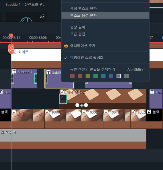 2. 타임라인의 텍스트를 우클릭하여 '텍스트 음성 변환'을 선택합니다.