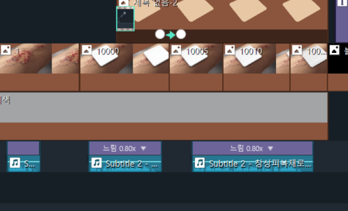 4. 텍스트의 타임라인에 맞추어 음성파일이 생성되며, 음성파일은 텍스트의 길이보다 길 수도, 짧을 수도 있습니다. 음성에 맞추어 영상을 조절하시면 됩니다. (아래 이미지에 생성된 음성파일의 느림 0.80%은 제가 사운드 옵션에서 임의로 속도를 조절하여 표기된 내용입니다.)